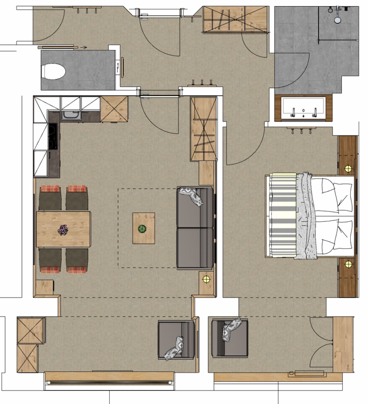 Apartment Typ 02 bietet ideale Wohlfühlmomente für Paare, Freunde und kleine Familien. Nordseitig gelegen, bietet es ein gemütliches Schlafzimmer, einen großzügigen Wohn- und Essbereich mit Schlafcouch, eine voll ausgestattete Küche, ein modernes Bad und ein separates WC – kompakt, komfortabel und charmant.