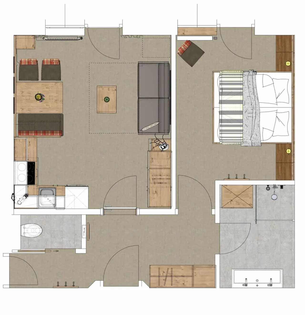 Apartment Type 05 is the ideal retreat for couples, friends, or small families who appreciate sunny hours and cozy evenings. South-facing and equipped with a balcony, it offers a comfortable bedroom, a bright living and dining area with a sofa bed, a fully equipped kitchen, as well as a modern bathroom and a separate toilet – compact, charming, and comfortable all at once.
