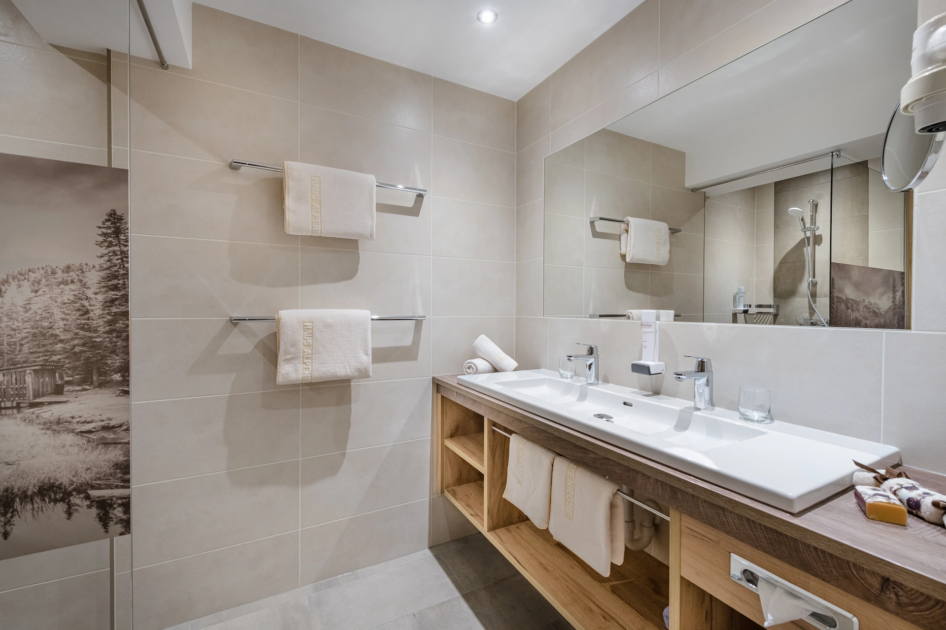 modern bathroom with shower, hair dryer, cosmetic mirror, shower gel, hand soap & tissues