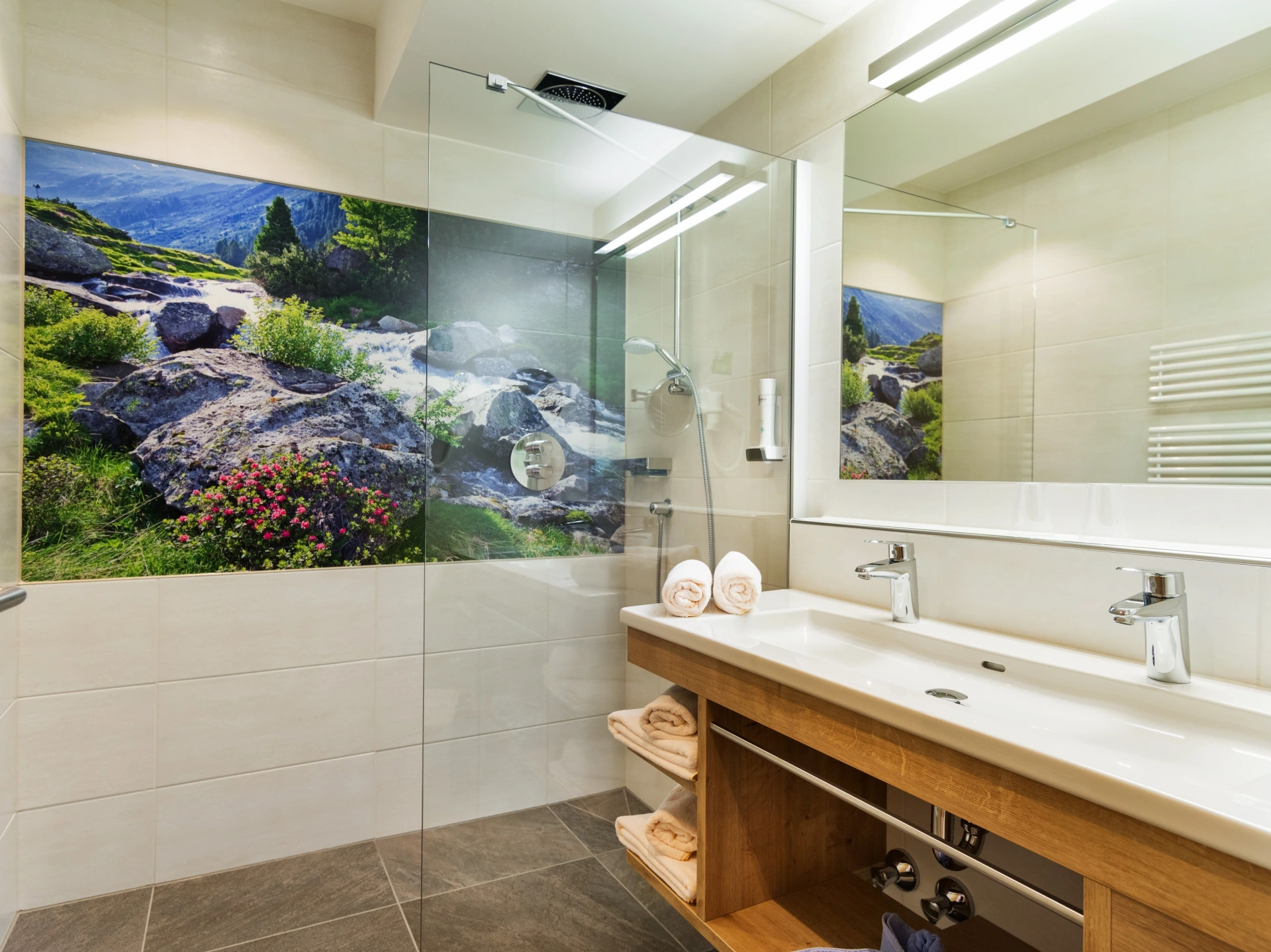 modern bathroom with rain shower, shower gel, vanity mirror, hand soap, hair dryer